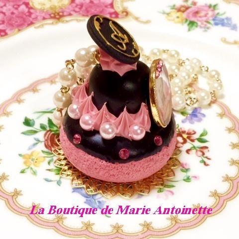 マリー・アントワネットのルリジューズネックレスNoir。本体約6×4cm。パールチェーン約46cm(アジャスター付)。フランス伝統菓子のコロンと可愛いルリジューズネックレス。お出かけはお菓子と一緒に♡♡(パールチェーンのチャームは、フォークまたは他のものが付く場合もございます)